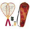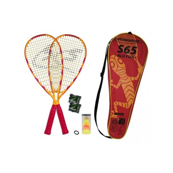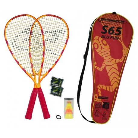 SET SPEEDMINTON S-65, composto por 2 raquetes S-65 em alumínio resistente, com um design atrativo , 3 Speeders , 2 SPEEDLIGHTS para jogar no escuro, 1 wind ring, 1 saco de transporte e regras de jogo.