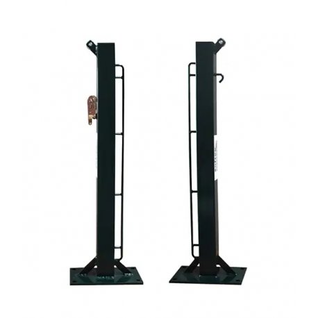 Conjunto de postes em aço de secção quadrada de 80x80mm. Concebidos para serem aparafusados ao solo com uma placa retangular de 33x22cm (furos de 2cm e distância entre centros de 29x15cm). Parafusos não incluídos. Inclui roquete de tensão para apertar o cabo da rede a instalar. Fabricado de forma a que a rede fique à altura regulamentar de 1,07mts. Ideal para instalações onde não são necessárias obras civis.