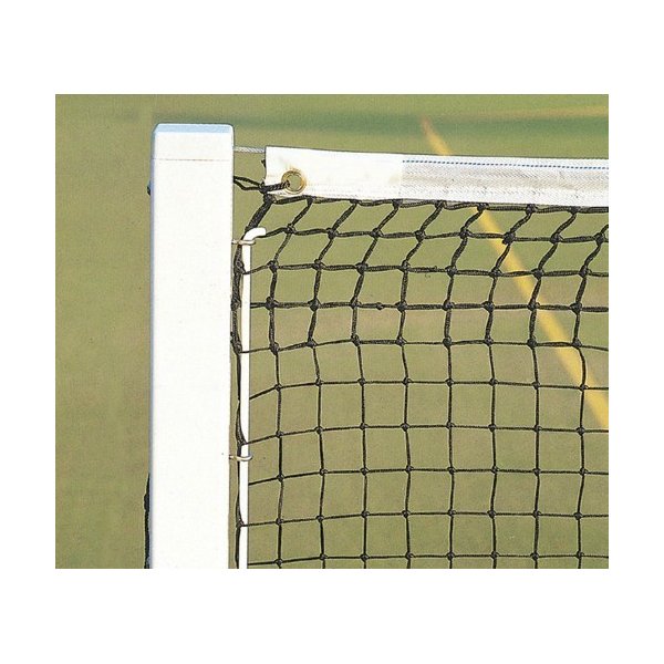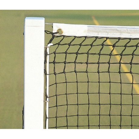 Rede de ténis competição em polipropileno preto de 2mm, malha de 45mm dupla em 10 malhas superiores e 1 malha inferior. Fita branca de PVC e cabo de aço.
