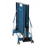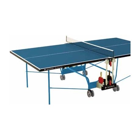 Mesa de ténis de mesa SCHILDKROT/DONIC SPACETEC OUTDOOR, para uso no exterior. Revestimento de resina de melamina à prova de agua, tampo com bordo lateral, modelo compact com recolha de tampos na vertical e formando plataforma com rodas amovíveis. Inclui rede e suporte de raquetes. Fabricado na Alemanha.