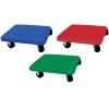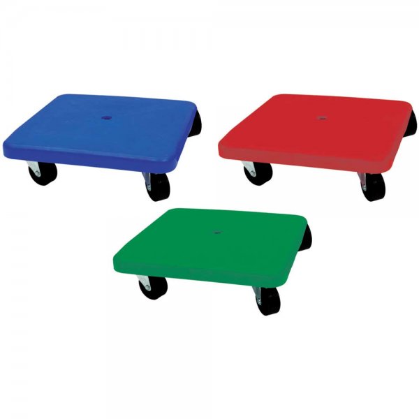 Em plástico resistente com rolamentos suaves.
