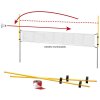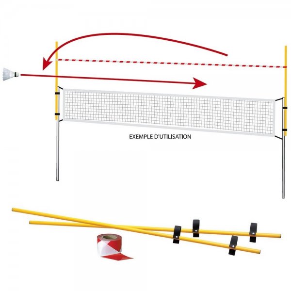 Fio para treino de precisão. Composto por 2 postes de 1,60 m, equipados com fechos de velcro e um rolo de fita de 250 m. Produto concebido em resposta à necessidade de professores de educação física para um badminton escolar.