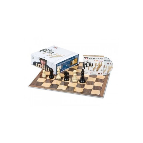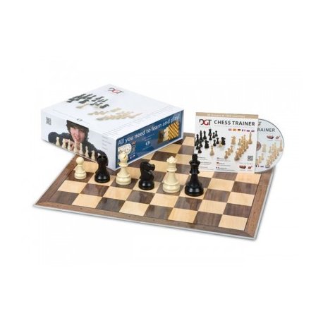 DGT Chess Starter Box (blue); Esta caixa contém tudo o que precisa para aprender a jogar xadrez:Um tutor com 45 lições e 1900 exercícios (Inglês); Tabuleiro dobrável cartonado 50x50cm e peças em PVC com 8,6cm (Rei).