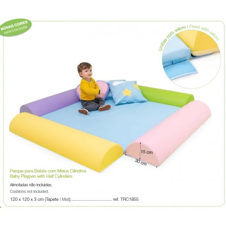 Parque para bebés com meios cilindros. MATERIAL espuma de poliuretano de 23kg/m3 e revestidos com tela impermeável, lavável, com tratamento ignífugo M2