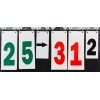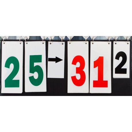 Marcador multidesportivo dobrável, composto por dois números de 0 a 99, um número de 1 a 4 e setas para saber o caminho do jogo. Dobrado: C.49 cm, A.28 cm.