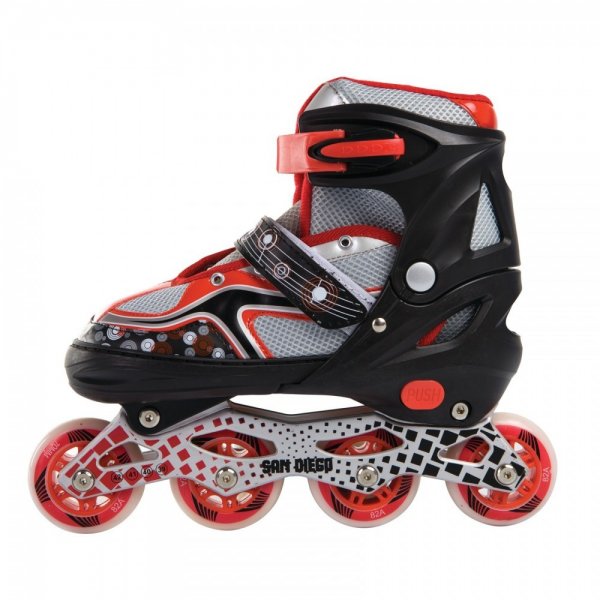 Patim em linha extensível SAN DIEGO, chassis em alumínio, bota suave, rodas de PU, rolamento ABEC-7, travão de PP e fecho fácil. Tamanhos (Nº1,31-34)(Nº2,35-38)(Nº3,39-42)