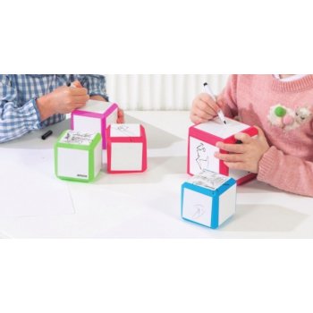 Dado personalizável. Pode ser usado como um dado tradicional ou com desenhos, palavras, personagens, etc.