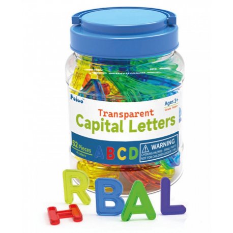 Cubo com 2 conjuntos de letras maiúsculas transparentes, uma ferramenta essencial para enriquecer a aprendizagem em ambientes educativos.