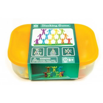 Este conjunto inclui uma variedade de bonecos empilháveis em diferentes cores e formas, juntamente com bases especialmente concebidas para os manter firmemente no lugar.