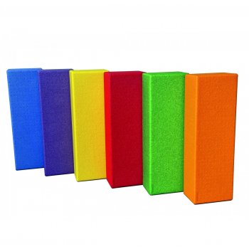 Disponível em seis cores: azul, amarelo, verde, laranja, vermelho e roxo. Cada cor com a mesma quantidade de blocos.