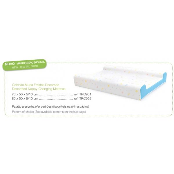 Colchão muda fraldas com 70x50cm com impressão - MATERIAL espuma de poliuretano de 23kg/m3 e revestidos com tela impermeável, lavável, com tratamento ignífugo M2