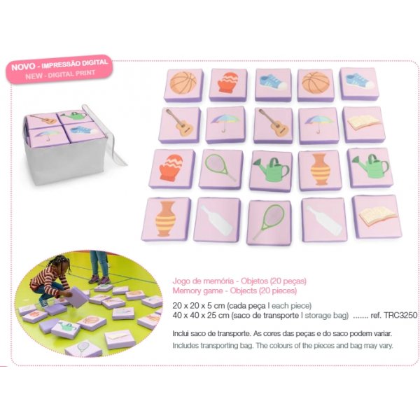 Jogo de memória - Objetos (20 peças) - MATERIAL espuma de poliuretano de 23kg/m3 e revestidos com tela impermeável, lavável, com tratamento ignífugo M2