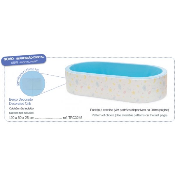 Berço Decorado com 120x60x25cm (para colchão com 108x48x10cm) - MATERIAL espuma de poliuretano de 23kg/m3 e revestidos com tela impermeável, lavável, com tratamento ignífugo M2