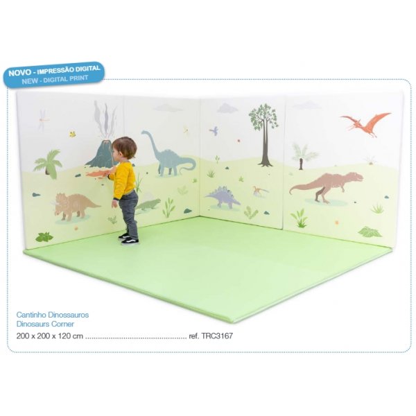 Cantinho Dinossauros com 200x200x120cm - MATERIAL espuma de poliuretano de 23kg/m3 e revestidos com tela impermeável, lavável, com tratamento ignífugo M2