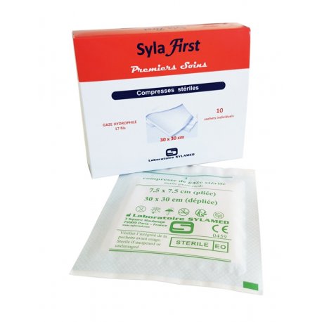 Conjunto de 10 compressas, embaladas individualmente. Tamanho dobrado: 7,5x7,5cm. Tamanho desdobrado: 30x30cm.