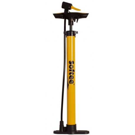 Bomba de pé equipada com diferentes bocais e adaptadores para encher diversos artigos: bolas, colchões, rodas de bicicleta...